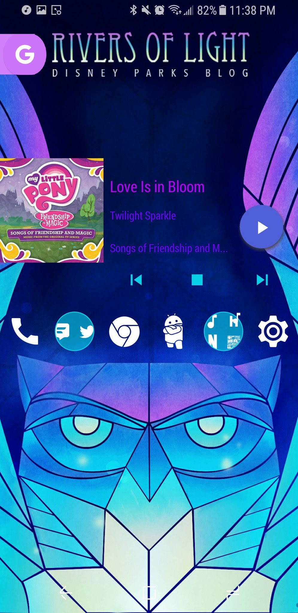 There are a lot of white icon packs out there, but few have the style and the sheer number of supported icons as Whicons by Randle. Whicons fairly glows against the darker portions of our Rivers of Light theme, helping them both mesh with the wallpaper and pop against its cool colors. By putting your icons into a single line between the owl spirit's head and the widgets, you keep the bottom of the screen clean and keep your icons a bit closer to where your thumbs gravitate on the screen.